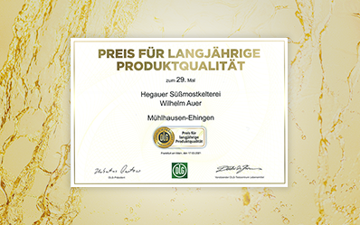 Höchste Auszeichnung der deutschen Ernährungswirtschaft – Hervorragendes Abschneiden in der DLG-Qualitätsprüfung für Fruchtgetränke. Die Süßmostkelterei erhält den Bundesehrenpreis dieses Jahr zum 10. Mal.