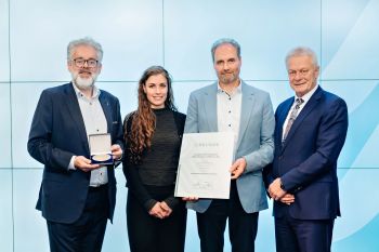 Bild: Bundesminister Alois Rainer (rechts) und DLG-Vizepräsident Dr. Diedrich Harms (links) überreichen Urkunde und Medaillen an Ulrike und Andreas W. Bohnenstengel.