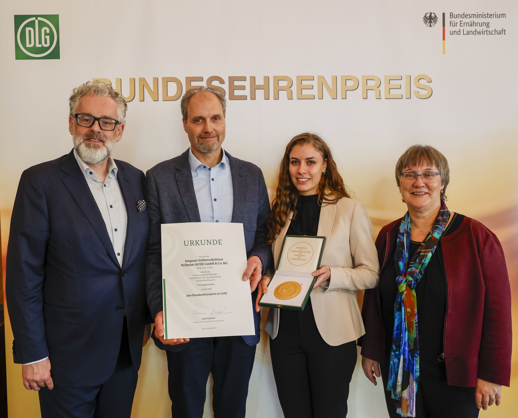 Das Bundesministerium für Ernährung und Landwirtschaft (BMEL) hat die Hegauer Süßmostkelterei Wilhelm Auer aus Mühlhausen-Ehingen mit dem Bundesehrenpreis in Gold für Fruchtgetränke geehrt. Das ist die höchste Qualitätsauszeichnung der deutschen Ernährungswirtschaft. Ministerialdirektorin Gaby Kirschbaum überreichte gemeinsam mit Dr. Diedrich Harms, Vizepräsident der DLG (Deutsche Landwirtschafts-Gesellschaft), Urkunde und Medaille in Berlin.